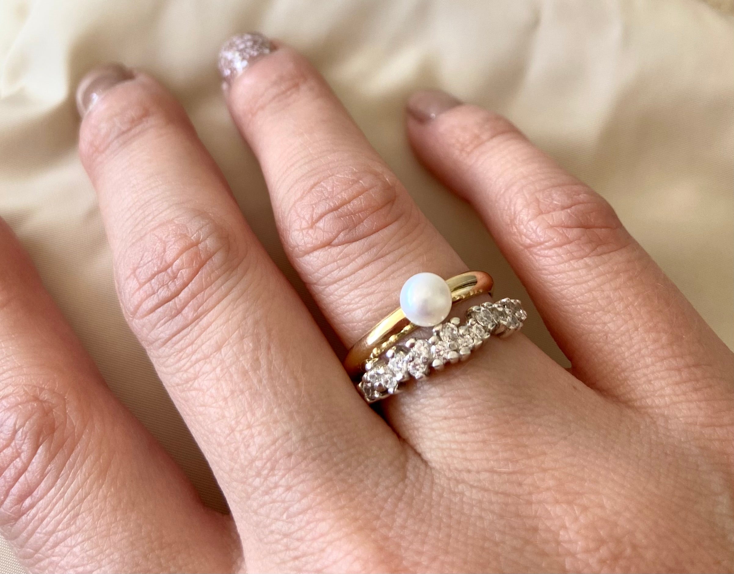 Anillo de Plata 950 y lámina de Oro 18k en todo el aro con perla de río. No se despinta, resistente a agua, perfume, alcohol. Todas las tallas disponibles. Todas nuestras joyas incluyen empaque de regalo.