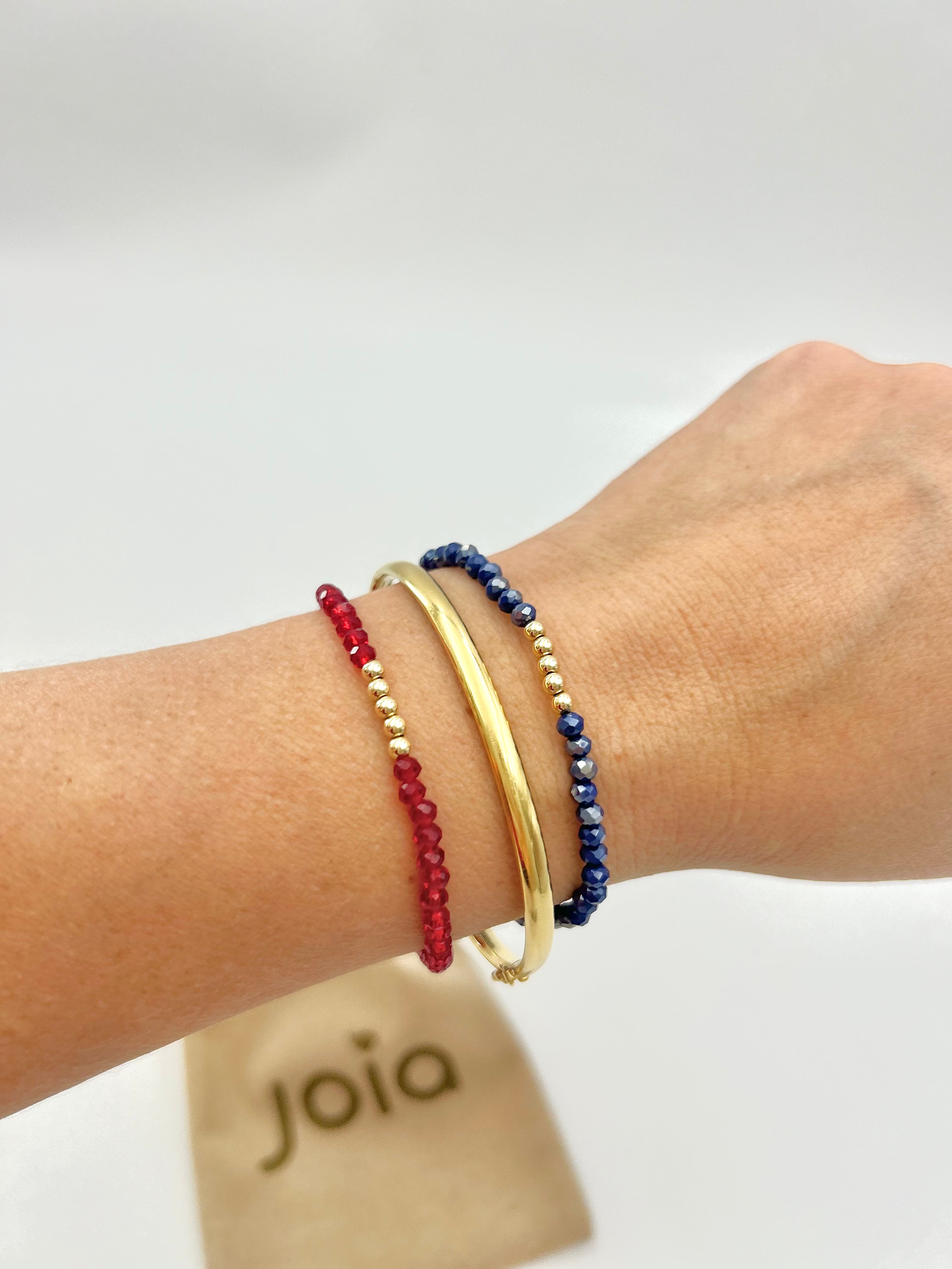 Pulsera con bolitas Goldfilled, muranos azules y elástico,  no se despintan, resistentes a todo, agua, perfume, alcohol, etc.  Todas nuestras joyas incluyen empaque de regalo.